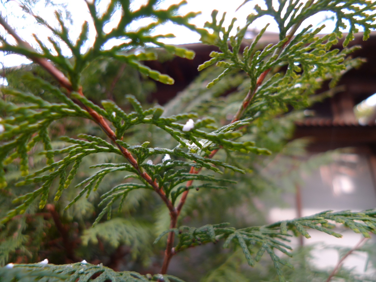 雪はすぐに解けてしまい、どんな粒だが見れない。葉っぱに雪が乗っているの発見!すぐに消えてまう。 |