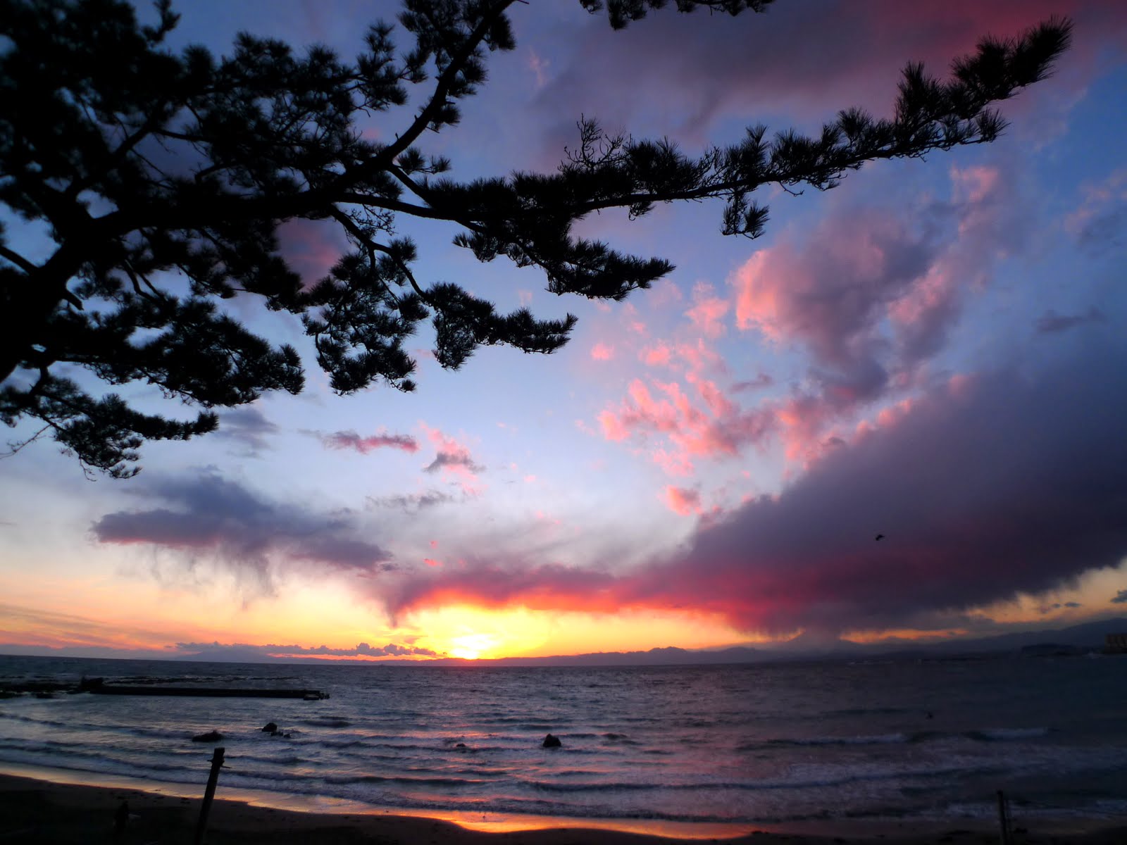 海に向かうがもう雪はやんでしまった。右奥に見えるのが雪雲。この綺麗な夕焼けでのお天気雪はどんな景色に見えたんだろう。 雪は普段とはまったく違う景色になるのが子供の頃から大好きで、お天気雪は最上級。青天の空から突然降る白い雪は、地上に降りると消えてしまう、さわやかなはかなさがいい。そんな雪を見上げるみんなの顔もいい。 |