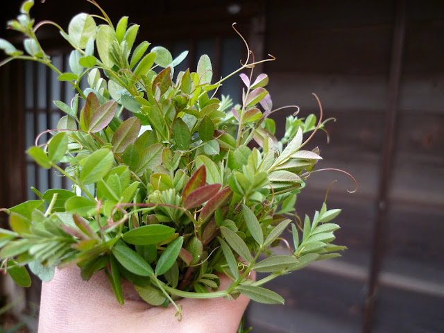 この時期の畑では露地野菜が寒くて成長しない。そんな最中、ぐんぐんすごい生命力で成長している野草を発見!その名はカラスノエンドウ。ツル植物なのでお互い絡み合いながらこんもり大きくなっていた。新芽の先端から10cm位下をちぎって収穫。 |