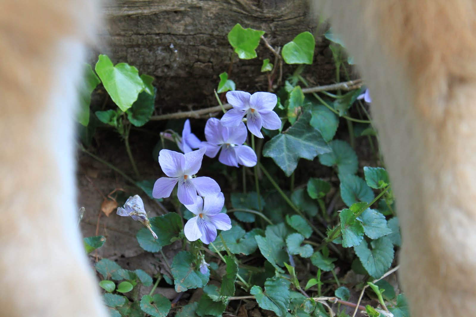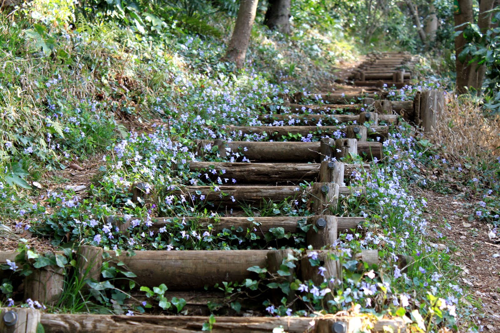 | 裏山散歩の道には、アオイスミレが階段を装ってなんだか花畑を歩いてる感覚だ。 |